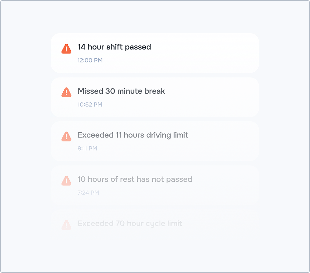 Receive real-time alerts any time an HOS or safety rule is breached. Know about violations instantly to act fast and keep your drivers and trucks safe.
