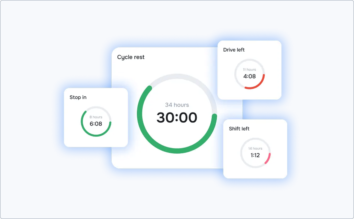Track driving shifts, breaks, and cycles with easy-to-read digital timers. Get warnings before driving limits are hit so you can plan rest times safely and avoid penalties.